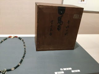 形、ぴったり合う例ないが、資料として、神社の神宝に似てるので、彼なりの根拠あったと思われる。ご自慢。一個ずつ材質、縄文からガラスについて上のパネルに説明あり。(文字小さくてわかりませんが)國學院大の方が整理してくれたそう。