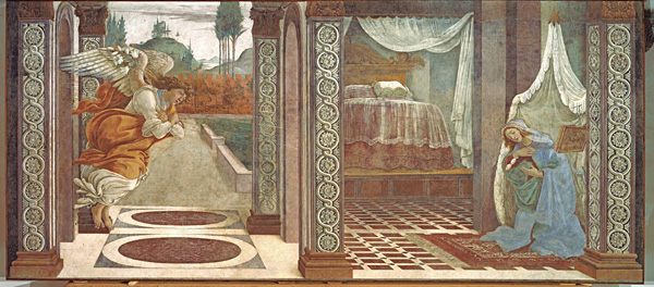 さて目玉の《受胎告知》のフレスコ。 大天使ガブリエルが空から飛んできたように左空中に浮遊して、マリアが右でははーっといわんばかりにひれ伏そうとしている。同じ横に長く展開しているダヴィンチのもう既に貫禄があるマリアに向かい片膝落として告知するガブリエルという構図の《受胎告知》に比べて、ガブリエル――神の使い、マリア――聖母になる前の人間といった印象が強いのは、天使と聖母の距離が結構離れているからそういう印象になるのかなぁ。。でもこの構図、個人的には好きだなぁ。